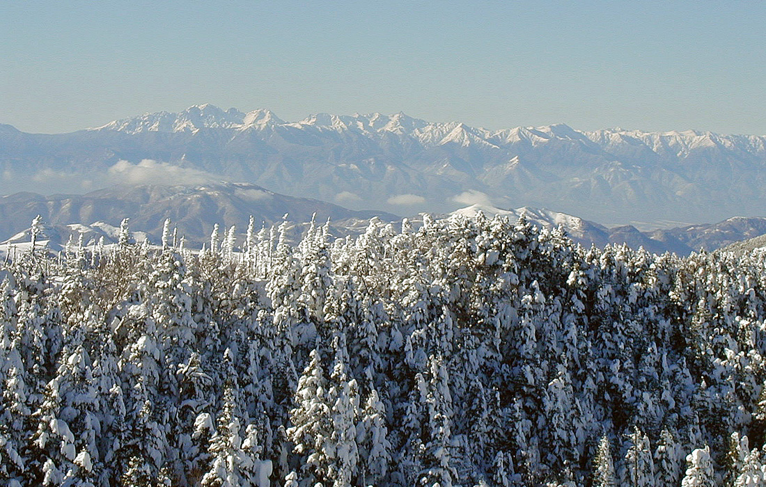 2002年の12月13日の天気予報で、翌14日の好天が予想されたので、早朝特急「あずさ」で茅野へ行き、ピラタスロープウエイで坪庭に登り、北八ヶ岳北横岳(2480m)の山頂から、日本アルプスの山々を撮影することにした。冬山と行ってもアプローチが短く、好天が予想ダレたので、一応ピッケルとアイゼンだけは用意したが、オーバーズボン、オーバー手袋なしの軽装で、向かった